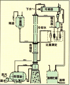本裝置適用于制藥、食品、輕工、化工等行業的稀酒精回收。也適用于甲醇等其他溶煤的蒸餾。本裝置根據用戶的需要,可根據30℃左右的稀酒精蒸餾至90℃-95℃酒精,成品酒精度數要求再高,可以加大回流比,但產量就相應減少。