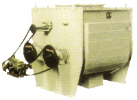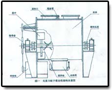 本機為臥式筒體,雙軸多槳結(jié)構(gòu)混合機體焊制成型.頂部裝有噴霧加液裝置,物料理自頂部加入,混合后由底部出料。